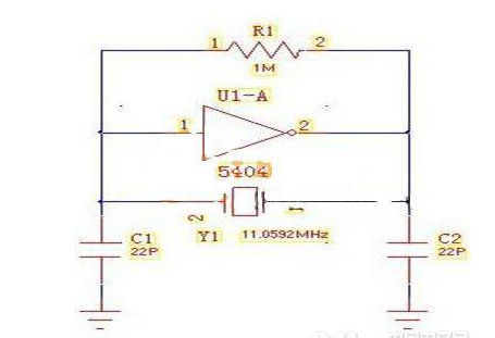 Y1是晶体,相当于三点式里面的电感,C1和C2就是电容,5404非门和R1实现一个NPN的三极管,接下来分析一下这个电路。